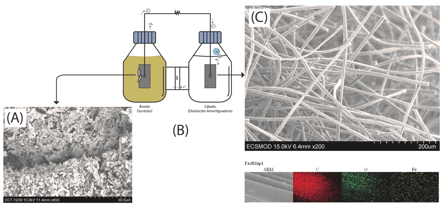 Figura 1. Celda microbiana utilizada en el desarrollo de los experimentos. (A) Imagen SEM de la biopelícula en el ánodo (850 aumentos). (B) Diagrama de celda. (C) Imagen SEM del electrodo modificado (200 aumentos) escaneo EDX.
