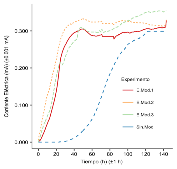 Al utilizar pH neutro se observó una disminución de la corriente máxima generada; este comportamiento se puede explicar debido a que las comunidades microbianas tienen un pH óptimo de crecimiento. Miembros de las especies del género Lactobacillus son capaces de desarrollarse a pH bajo. El agua residual en el procesamiento del café tiene un pH inferior a 4,0, y se han identificado varias especies del género Lactobacillus spp en este tipo de sustrato [49, 50].