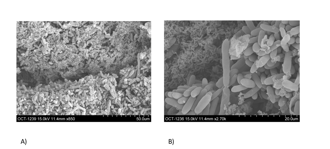 La corriente generada por las celdas es dependiente de las bacterias presentes en los electrodos; en el caso de las celdas alimentadas con el agua residual del procesamiento de café, se observa una comunidad microbiana presente en la biopelícula (Figura 4), que en estudios preliminares fueron determinados como pertenecientes a las bacterias acido-lácticas (BAL), del cual muchas especies han sido reportadas como bacterias electrogénicas [54-56]. Las especies predominantes, además de hongos y algunas levaduras, en las celdas microbianas con sustrato de aguamiel de café son Lactobacillus casei y Latobacillus paracasei [57], estos resultados concuerdan con el uso de bacterias de estas especies en celdas microbianas por otros autores [50].