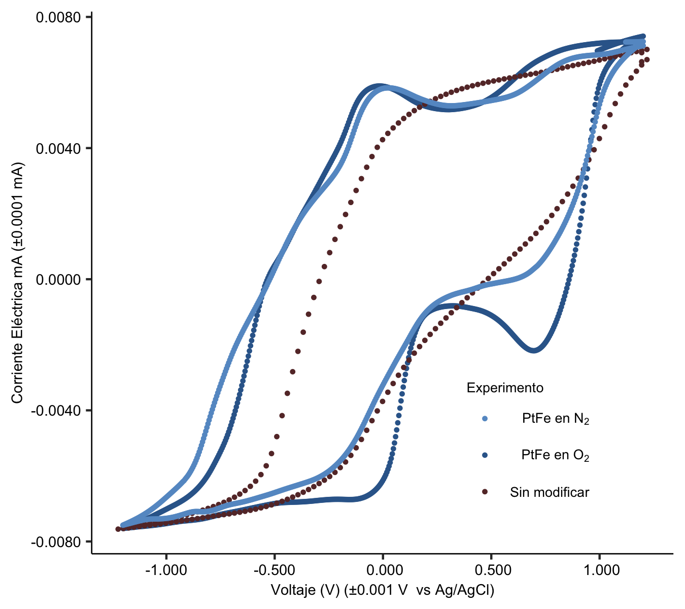 La actividad electrocatalítica del electrodo modificado con FePc/MWCNT se examinó con una voltamperometría cíclica en 0,1 mol/L de amortiguador de fosfatos (pH = 7) saturado en aire o en nitrógeno. Como se observa en la Figura 3, en el experimento saturado con nitrógeno se aprecia la presencia de una señal de oxidación de la FePc (II); este valor es esperado para un catalítico que debe adsorber oxígeno reversiblemente. Se observa, además, en la misma figura, que la voltametría en nitrógeno no muestra signos de actividad catalítica del compuesto, con ausencia de señales en el rango de −0,100 V a +0,650 V vs. Ag/AgCl, en la voltametría correspondiente a la solución saturada en aire; la presencia de oxígeno permite dar paso a la ORR y dar su corriente de reducción catalítica; la señal se aprecia a un voltaje de +0,650 V vs. Ag/AgCl para este sistema; este potencial está dentro del ámbito esperado para la ORR a pH = 7 y confirma la actividad del compuesto. El análisis se llevó a cabo durante . ciclos (n = 200), y únicamente se observó actividad ORR durante los primeros dos, lo que muestra inestabilidad de la FePc en disolución.