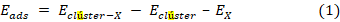 Donde X = CO u O2, Eclúster-X es la energía total del complejo formado por el clúster con X absorbido, Eclúster es la enrgía total del clúster aislado y EX es la energía total de la molécula X aislada.