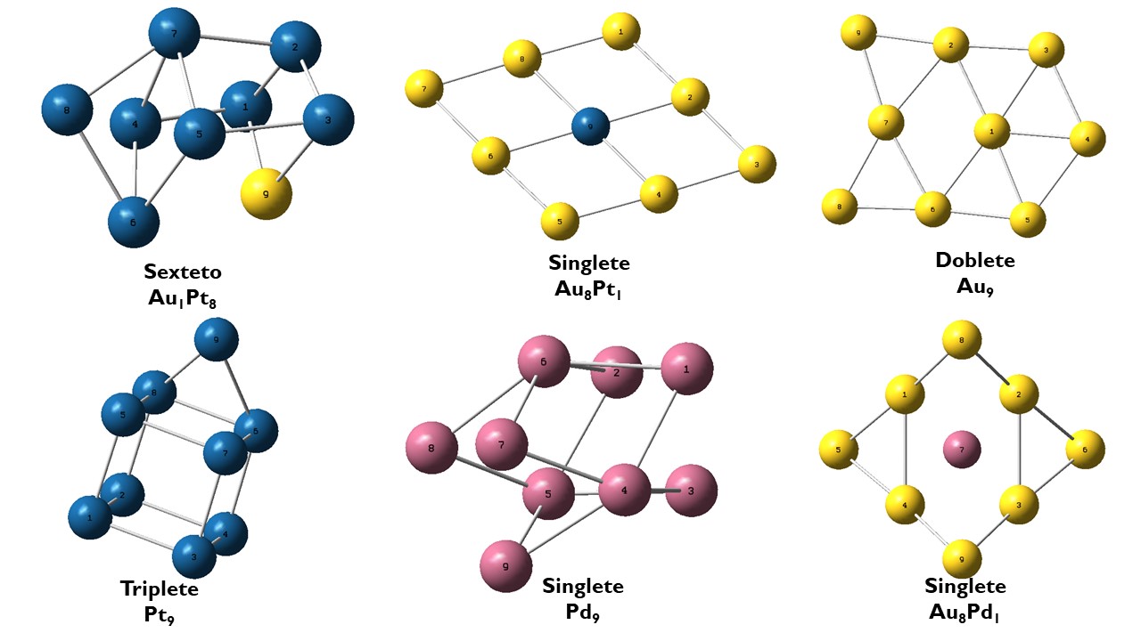 Se estudiaron los clústeres de nueve átomos Au9, Au8Pd, Au8Pt, AuPd8, AuPt8, Pd9 y Pt9, con el objetivo de determinar el efecto de incluir un segundo metal en los clústeres de Au9, Pd9 y Pt9. La elección del tamaño de clúster fue realizada acorde con la GapHOMO-LUMO; con base en ello, se obtuvo que el clúster más reactivo es 𝐴𝑢. para el grupo de clústeres de 6 a 9 átomos de oro. GapHOMO-LUMO (eV): Au6: 0,20, Au7: 0,15, Au8: 0,17, Au9: 0,13; los cuales se calcularon con la aproximación CAMB3LYP/LanL2DZ. Las estructuras más estables se determinaron considerando las tres multiplicidades más bajas (singlete, triplete y quinteto o doblete, cuarteto y sexteto, para número par e impar de electrones, respectivamente), resultando en cada caso la mayor estabilidad para la multiplicidad más baja.