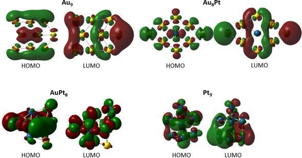 Figura 2. Esquema de los orbitales frontera (HOMO y LUMO) para los diferentes clústeres Au9, Au8Pt, AuPt8 y Pt9.