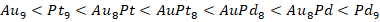 En cuanto a la multiplicidad de los clústeres, es importante indicar que la multiplicidad es mayor para el átomo de paladio 4d10 en el clúster que contiene solo este tipo de átomo, es decir, quintete [50]. Esto puede explicarse por el hecho de que parte de la densidad 4d se promueve en la órbita de los 5s para proporcionar enlaces metal-metal estables. Por otro lado, la baja multiplicidad del clúster Au. puede ser atribuida al electrón en la capa 6s, el cual es capaz de inducir un vínculo metal-metal más estable que en el clúster Pd9.