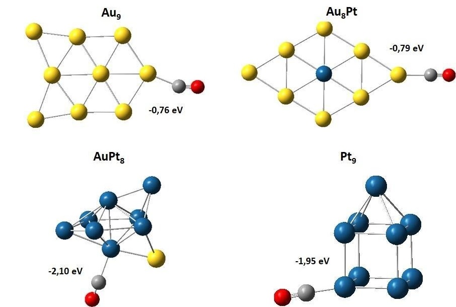 Dado que se genera tal descompensación electrónica en el volumen de la superficie de los clústeres, otra molécula de CO se adsorbe y se genera un acercamiento produciendo una etapa adicional. En este caso, el clúster que requiere menor costo energético es el sistema Au8Pt