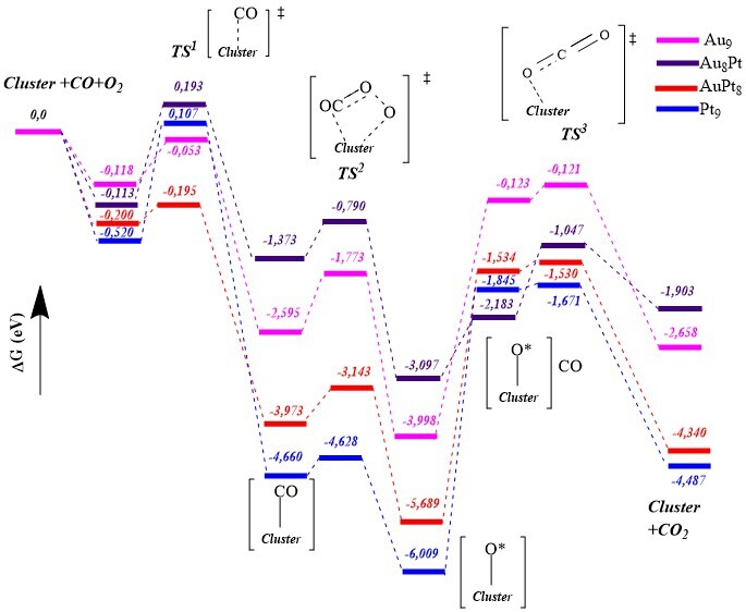 Después del acercamiento entre la molécula de CO hacia la superficie descompensada por el oxígeno incorporado sobre cada uno de los materiales, ocurre un ataque nucleofílico entre la molécula de CO hacia el oxígeno vacante. Esto se da, en particular, por la necesidad de compensar la carga del clúster y generar un balance de masa adecuado en la estequiometría de la reacción. Por último, se genera cada uno de los estados de transición para cada clúster, en donde la energía de activación favorece la formación del dióxido de carbono sobre Au9 yAuPt8 miesntras que en los casos de Au8Pt y Pt9