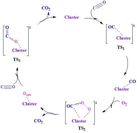 El mecanismo general, incluyendo cada una de las etapas, permite establecer las interacciones de cada uno de los adsorbatos en la superficie de cada clúster. En este sentido, en las Figuras 4 y 5 se muestra la ruta de reacción, incluyendo los estados de transición, de la formación de dióxido de carbono a partir de los sustratos de CO y O2 usando cada uno de los clústeres seleccionados. Se puede apreciar que la reacción se divide en dos etapas: la primera relacionada con la adsorción de una molécula de monóxido de carbono y su oxidación a dióxido de carbono, y luego, la formación de un intermedio oxígeno-clúster que conduce a una descompensación de la superficie del material. En la segunda etapa de la reacción, otra molécula de CO se adsorbe sobre el intermedio oxígeno-clúster y, por último, ocurre una segunda desorción de una molécula de CO2. Como era de esperarse, por cada molécula de oxígeno se producirán dos moléculas de dióxido de carbono generando una alta productividad en los clústeres estudiados. Sin embargo, tanto en los estados de transición como en los intermediarios generados en la adsorción preferencial de oxígeno, cambia drásticamente la adsorción y esto se puede observar en las barreras energéticas obtenidas para cada material.