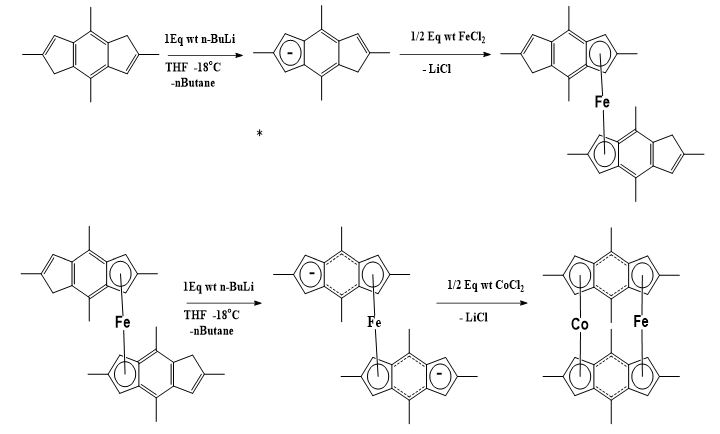 This compound was prepared by stepwise salt elimination by treating ligand L1 with one equivalent of n-butyl lithium to produce monoanion of the ligand (Li+1L1-1) and this was first treated with one mole of anhydrous FeCl2 producing the ferrocene type complex with L1 (Figure 3). The compound so produced was reported earlier by the Manriquez group. The characterisation of this compound matches well with the reported findings [18-19]. This mono iron organometallic complex was further treated with two mole equivalent of n-butyl lithium and with one equivalent of anhydrous CoCl. affording the brown colour solution. After purification and drying, itoffered the brown coloured compound. The NMR shows the two shifts for the C-H of Cp rings in indacene at 4.92 and 5.25 ppm respectively for cobalt and iron next tothe bis indacenyl ring. However, due to residual paramagnetism, the peaks are broad. The IR frequency characteristic of the metal-carbon bond appeared at 585 cm-1.