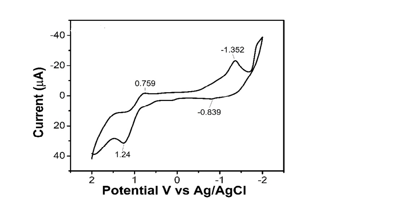 Cyclic voltammetry studies of complexes 1, 2,and 3 were carried out in dichloromethane solvent with tetrabutyl ammonium tetra fluoroborate as a supporting electrolyte. Cyclic voltammogram of 1 presents a first reversible redox couple and a second irreversible couple. The potential values change with the scan rate. At 50 mVs-1. The oxidations (Epa) occur at Epa1 = -1150 and Epa2 = 0.789 vs the saturated calomel electrode. Controlled potential electrolysis at 0.789 V allowed us to determine that 1 equivalent of charge per mole of the complex has been transferred in this first redox process. Separation between two oxidation potentials ΔE is 1939 mV reveals the high degree of electronic delocalisation in the system. Complex 2 also shows a much stronger interaction than complex 1 (Figure 4). At 50 mVs-1 scan rate in the dichloromethane as solvent, the first oxidation occurs at -1352 mV attributed to the oxidation of Co+2 to Co+3 and the second oxidation at 759 mV corresponds to the oxidation of Fe+2 to Fe+3. ΔE between two oxidation potentials is 2111 mV. This suggests the strong coupling between the metal and the ligand.