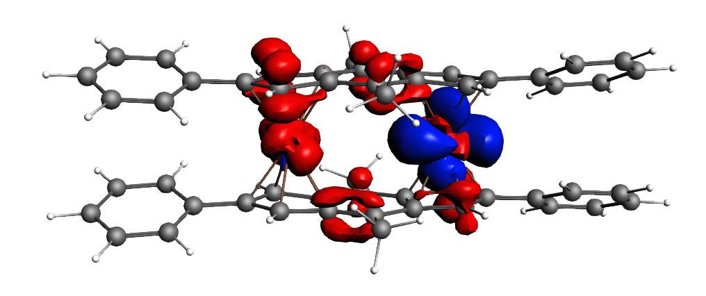 The possible change in the oxidation state is further evidenced by the DFT calculations. The calculations were carried out on the similar compound L2Fe2 where L = 2,6 di phenyl 4,8 di methyl s-indacene. This indicates there exists a charge transfer from one metal centre to the other. In Figure 5, the colour red shows the depletion in the electron density and the colour blue shows the increase in electron density. The molecular orbital diagram in Figure 6 shows the ground state isa triplet.