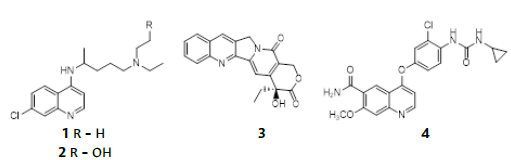 Como fragmento privilegiado, la quinolina es una molécula plana rígida, que se comporta como un farmacóforo presente en el núcleo de numerosos agentes fisiológicamente activos que muestran interesantes propiedades terapéuticas; por ejemplo, la cloroquina (CQ) 1, hidroxicloroquina (HCQ) 2, camptotecina 3, levatinib 4 [20]-[23] (Figura 1). Del mismo modo, cuando las quinolinas están constituidas en su estructura, con heteroátomos como el azufre, han resultado ser efectivas en modelos de enfermedades en donde su mecanismo de acción se ha asociado con la inhibición de la formación de ß-hematina, inhibición de la adhesión, migración, e invasión celular, inducción de apoptosis, estrés oxidativo, por su acción antipalúdica y antituberculosa, como agentes hipocolesterolémicos, y por su actividad antiproliferativa contra células cancerosas [24]-[32].