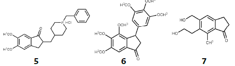 Otro núcleo privilegiado está constituido por la indanona, que en combinación con aldehídos genera las arilidenindanonas, que son consideradas como las primas rígidas de las chalconas y se generan incorporando al sistema αβ-insaturado cetónico de chalconas un anillo cíclico de cinco miembros. Generalmente son sintetizadas a partir de 1-indanona y benzaldehídos por medio de una reacción aldólica, por ejemplo, los compuestos 5 y 6 con actividad para el tratamiento de la enfermedad de Alzheimer y antineoplásicos, respectivamente [33], [34]. En la naturaleza encontramos algunas indanonas como la pterosina P 7 aislada del helecho de la especie Pteridium aquilinum [35]-[37], con actividad como antibacteriano, antiespasmódico, citotóxica, entre otras actividades [38], [39] (Figura 2).