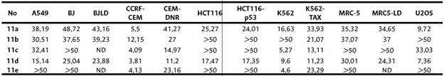 A partir de estos resultados, es obvio, con algunas excepciones, que el derivado 11d exhibió una citotoxicidad selectiva más pronunciada (en comparación con las células BJ y MRC-5) contra las células cancerosas humanas de HCT116 (cáncer colorrectal humano con p53 de tipo salvaje) y HCT116p53-/- (cáncer colorrectal humano con p53 eliminado), así como líneas celulares de leucemia (CCRF-CEM, CEM-DNR, K562 y K562-TAX), pulmón (A549) y células de osteosarcoma (U2OS). También se detectó una buena selectividad en los compuestos 11c y 11e para células cancerosas leucémicas y colorrectales (con y sin deleción de p53) (en comparación con MRC-5). Con respecto al compuesto 11a, exhibió una selectividad moderada (en comparación con las líneas celulares BJ y MRC-5) para las células A549; sin embargo, presentó buena selectividad (en comparación con las células BJ y MRC-5) para las células cancerosas derivadas de pulmón, carcinoma de colon, así como en células leucémicas y de osteosarcoma.