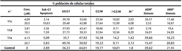 Por otro lado, queríamos averiguar si los compuestos 11a-e pueden detener el ciclo celular de las células cancerosas, como se reportó anteriormente para la cloroquina y análogos [49]- [54]. Con el fin de obtener una descripción más detallada de la actividad biológica de los derivados estudiados, realizamos un análisis del ciclo de las células CCRF-CEM más sensibles después de 24 h de incubación con los nuevos derivados de 7-cloro-(4-tioalquilquinolina) (Tabla 2).