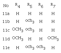 Para la síntesis de los derivados 11a-e, se realizaron varios intentos a fin de alcanzar el aldehído respectivo 9; entre los procedimientos empleados se mencionan diferentes agentes oxidantes, como el ácido 2-iodoxibenzoico (IBX), ácido 2-iodobenzoico estabilizado (SIBX), reacción de swern y el reactivo de Dess-Martin (DMP); sin embargo, el mejor resultado fue encontrado con el reactivo de DMP, con el cual se obtuvo el compuesto 9 (Figura 3); debido a su inestabilidad no fue posible su purificación, por lo que se usó sin caracterización previa en el siguiente paso de reacción. La reacción de condensación se realizó con diferentes indanonas 10a-e, empleando como base di-isopropilamina de litio (LDA), en tetrahi-drofurano (THF) seco, atmosfera de Ar, a una temperatura de -78 °C. La reacción se completa en un período de 50 min aproximadamente, con rendimientos que van desde 55 a 75%. Obtenida la mezcla de diasteroisómeros, se realizaron intentos para separar dicha mezcla, por medio de una columna cromatográfica, en donde se elevó progresivamente la polaridad de la fase móvil, pero no se obtuvo la separación deseada.