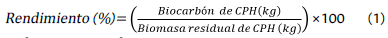 La pirólisis se efectuó en un reactor térmico de doble cilindro para la conversión térmica de la biomasa residual I. Las condiciones de calentamiento fueron de 10 °C/min hasta 350 °C: se colocó la bio-masa residual previamente pesada en la cámara térmica del reactor durante 2 h [29]. Después se retiró del fuero y se dejó enfriar por 5 h; a continuación, se sacó la biomasa convertida en biocarbón y se pesó para determinar el rendimiento (%) mediante la Ec. 1 [19]. Todas las muestras de biocarbón obtenidas fueron trituradas y tamizadas en un tamiz de 2 mm a fin de homogeneizar y almacenar en fundas plásticas para su análisis [30].