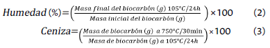 El contenido de humedad y cenizas del biocarbón se determinó por diferencia de peso [19]. Para obtener la humedad, se dividió la masa del biocarbón después de 24 h en la mufla a 105 °C para la masa del biocarbón almacenado (Ec. 2) [30]. Para obtener la ceniza se dividió el valor de la masa del biocarbón a 750 °C por 30 min en una mufla, para la masa obtenida a 105 C/24 h (Ec. 3).