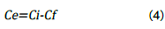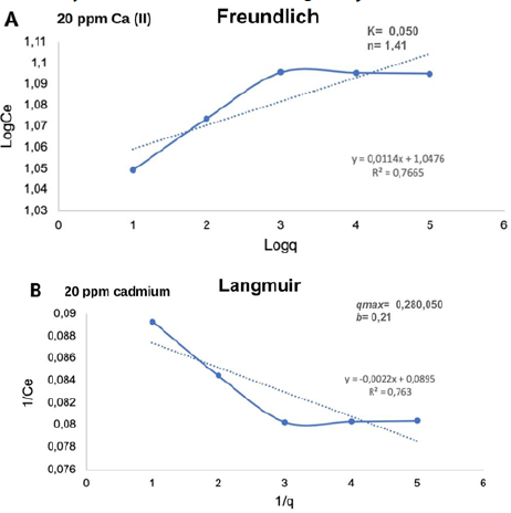 Con los valores de concentración de cadmio y el tiempo se calcularon los modelos Freundlich y Langmuir. El modelo de Freundlich es ampliamente utilizado para describir la capacidad de adsorción de diferentes materiales y entender cómo los solutos se adhieren a las superficies sólidas en diferentes condiciones. Mientras que el modelo de Langmuir es útil para comprender cómo la adsorción se satura a medida que los sitios activos en la superficie se llenan y cómo la concentración en la solución afecta la cantidad de sustancia adsorbida. Para obtener la representación gráfica de ambos modelos se utilizó la Ec. (4) tomada de Romero-Bonilla et al. (2022), a fin de calcular la concentración de equilibrio (Ce), la concentración inicial (Ci) y la concentración final (Cf) [31].