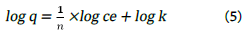 Donde q es la cantidad de soluto que es sorbido por el biocarbón en un tiempo determinado (mg de metal/g de biocarbón), kcorrespon-de a la capacidad de sorción en la fase de solución, n es el parámetro asociado a la absorción.