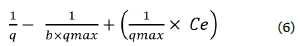 q bxqmax \qr Donde q es la cantidad de soluto que es adsorbida por el biocarbón en un tiempo dado (mg/g), qmax es la capacidad máxima de adsorción (mg/g), b es el parámetro de la Ec. (6) relacionado con la afinidad del absorbente del Cd2+.