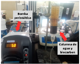 Las isotermas de adsorción de cadmio se adquirieron mediante experimentos por lotes. Se colocaron muestras de biocarbón de 20 g de peso en una columna de plástico de 150 mL con una solución de iones de cadmio de 20 ppm. El pH inicial de la solución (100 mL) se ajustó a 5,0 +0,1 con HCl. Se utilizó una bomba peristáltica (BOI-BASEC; Alemania) (Figura 1), que se conectó a la columna de plástico, para crear el sistema de recirculación. La bomba funcionaba a 10 rpm a 25 °C. Se tomaron alícuotas de 5 mL de muestra cada 30 min durante un período de 150 min. Las muestras recogidas se analizaron con un espectrómetro de absorción atómica Perkin (modelo Elmer 300d, EE. UU.) para determinar la concentración del metal Cd2+ en equilibrio.