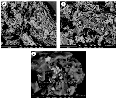 La Figura 2C, que fue tomada a una escala de 10 / m revela que los poros presentes en el centro de la imagen son de tamaños variados y sus bordes no tienen una forma circular. Esto se atribuye a una carbonización insuficiente. Otros estudios a temperaturas superiores a 600 °C muestran imágenes con estructura de panal claramente definida [20], [21]. El rango de temperatura es un limitante de la adsorción de metales pesados con relación a los biocarbones obtenidos a temperaturas mayores de 500 °C [17].