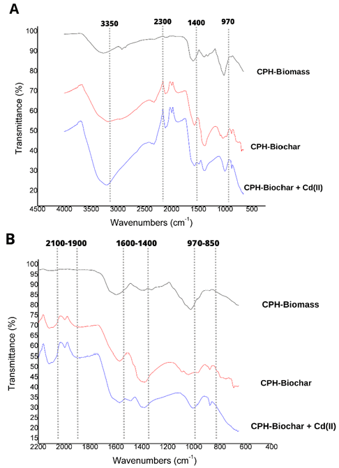 La espectroscopia infrarroja (FTIR) es una de las técnicas más útiles para caracterizar los grupos funcionales de la superficie del biocarbón. La Figura 3 muestra los espectros FTIR para CPH, biocarbón y biocarbón + Cd2+ después del ensayo de adsorción. En las tres muestras en las bandas entre 3400 y 3350 cm-1 se formó un pico que se atribuye al grupo hidroxilo (-OH). En las bandas entre 2300 y 1900 cm-1 se produjeron varios picos en las muestras de biocarbón y biocarbón + Ca+2, espectros característicos de los compuestos aromáticos hidroxilo, carboxilato y fenólico. El pico en las bandas entre 1600 y 1400 cm-1 en las muestras de biocarbón y biocarbón + Cd2+ son anillo aromático C=O y C=C. El estrechamiento de los espectros en la banda de 970 cm-1 indica la presencia de carbonatos. Los espectros obtenidos en las bandas de 3500 a 3200 cm-1 se forman debido al contenido de humedad en las muestras [20], [26], [39].