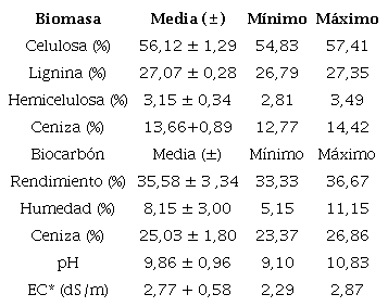 Los resultados estadísticos descriptivos de celulosa, lignina, he-micelulosa y ceniza de CPH y el análisis proximal del biocarbón se muestran en la Tabla 1.