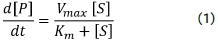 La velocidad de formación del producto en la expresión anterior, d[P]/dt,se representa por medio de un reacomodo matemático de la ecuación de Michaelis-Menten y se muestra a continuación (Ec. 1):