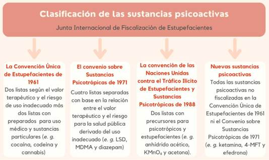 Existen varias formas de clasificar las drogas de acuerdo con el interés de quien hace la clasificación. Por ejemplo, se pueden agrupar por sus efectos farmacológicos en depresoras, estimulantes o alucinógenos; es posible clasificarlas por el origen en naturales, semisintéticas o sintéticas; se pueden separar por su condición de legalidad en legales, ilegales y no controladas; incluso se pueden diferenciar por sus propiedades fisicoquímicas o por su estructura molecular [35], [36]. La forma más común de clasificación de las sustancias psicoactivas es por medio de los tratados del sistema internacional de fiscalización de drogas impulsados por la ONU a través de la Junta Internacional de Fiscalización de Estupefacientes (JIFE), tal como se desglosa en la Figura 1 [37]-[39].