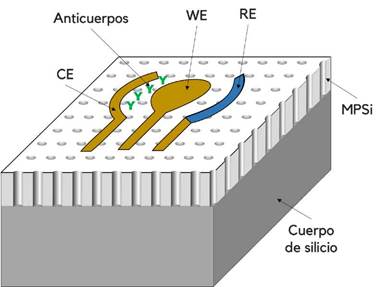 Entre los sensores con los mejores límites de detección para el fen-tanilo (0,006 gg/mL usado en una disolución tampón de fosfatos) se encuentra el dispositivo propuesto por Natalia Tokranova et al. [139]. El inmunosensor consta de un electrodo indicador de oro depositado sobre un sustrato de silicio poroso (MPSi) y anticuerpos policlonales inmovilizados sobre la superficie del oro y sobre algunas partes del MPSi, tal como se aprecia en la Figura 10. Este prototipo combina el uso de materiales metálicos, de materiales con grandes áreas superficiales y de moléculas de origen biológico, con el propósito de aumentar su sensibilidad. Para demostrar la efectividad de los anticuerpos, los investigadores realizaron curvas de SWV con el dispositivo construido sobre los siguiente sustratos: silicio, silicio poroso (MPsi) y MPSi funcionalizado con anticuerpos. El objetivo a posteriori es desarrollar un sensor accesorio para medir fentanilo en el sudor humano, cuyo LOD resultó ser de 11 ng/mL en esta matriz.