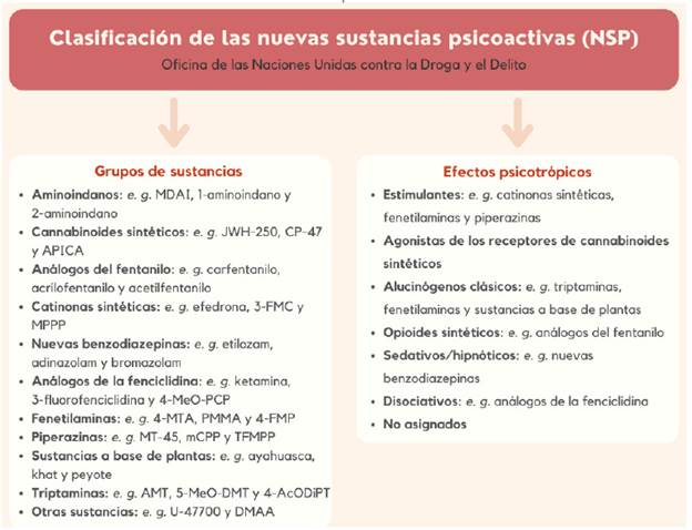 Existen varios criterios para clasificar las NSP, tal como sucede con la clasificación general de las sustancias psicoactivas; por lo tanto, no hay una forma universal convenida para categorizar estas drogas. Así, es usual encontrar diferencias en las listas que brindan entidades como la ONUDD, el OEDT o la DEA (siglas en inglés de U.S. Drug Enforcement Administration) por mencionar algunas [23], [43], [48]. En la Figura 2 se muestra la clasificación más reciente hecha por la ONUDD, en la que se incluyen once clases basadas en el grupo de sustancia y siete categorías basadas en los efectos farmacológicos.