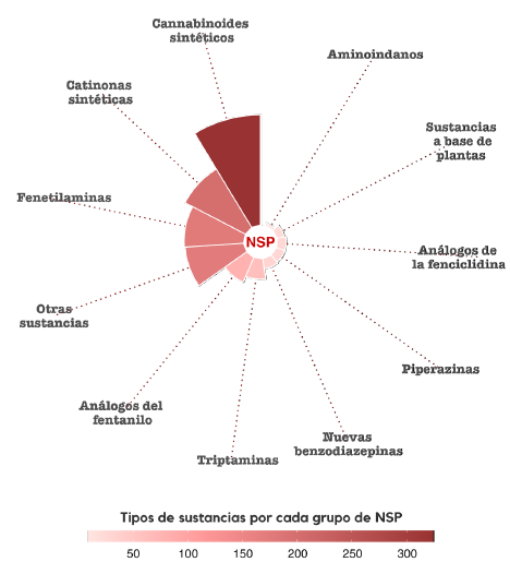 En el periodo del 2016 al 2022 la mayoría de las NSP identificadas a nivel mundial fueron estimulantes del tipo catinonas sintéticas y fenetilaminas, seguidas de los cannabinoides sintéticos, a pesar de la disminución observada en la cantidad de incautaciones de estas sustancias desde el 2015 [42].