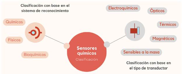 Los sensores modernos se emplean para detectar múltiples parámetros de la vida cotidiana. La clasificación general de los sensores se establece con base en el principio fundamental de las mediciones contemplado en su diseño. Los tres grupos principales son: químicos, físicos y biológicos. La Unión Internacional de Química Pura y Aplicada (IUPAC del inglés International Union of Pure and Applied Chemistry) definió un sensor químico como un dispositivo que transforma la información química, desde la concentración de un componente específico de la muestra hasta el análisis de la composición total, en una señal analíticamente útil. La información química puede provenir de una reacción química del analito o de una propiedad física del sistema investigado [49].