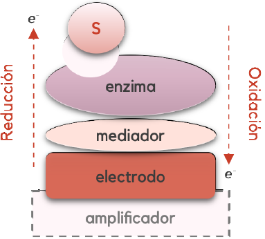 Unas de las enzimas más empleadas en el diseño y construcción de los biosensores catalíticos son las oxidorreductasas, un tipo de biomoléculas que catalizan la transferencia de electrones en las reacciones tipo redox; cualidad que resulta muy útil para el desempeño analítico del sensor electroquímico. Si bien dicha transferencia electrónica entre el centro redox de la proteína y la superficie electródica puede suceder de forma directa, la transferencia no siempre ocurre con facilidad, debido al aislamiento que generan las mismas cadenas polipépticas. En estos casos es recomendable modificar estructuralmente la superficie del electrodo o utilizar moléculas mediadoras para mejorar el flujo de transferencia de electrones como se representa en la Figura 5 [76].
