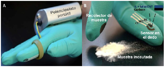 Los nuevos dispositivos de detección miniaturizados han provisto a la comunidad científica de aplicaciones modernas para el monitoreo analítico en tiempo real en las pruebas de drogas. Ciertas características de los sensores electroquímicos -como la fácil manipulación, una mínima huella residual relacionada con la capacidad de analizar microcantidades de muestra, así como un bajo costo para el diseño y el desarrollo del dispositivo- destacan la idoneidad para los análisis in situ [109]. Hazhir Teymourian et al. realizaron un estudio de revisión sobre sensores portátiles no invasivos para el análisis de drogas terapéuticas y de abuso en fluidos corporales [110]. Aquí se destacan tecnologías empleadas en dispositivos sensibles que pueden ser usados como prendas o accesorios, tales como guantes o anillos, lo cual evidencia la versatilidad y el potencial que tienen los sensores en aplicaciones in situ.