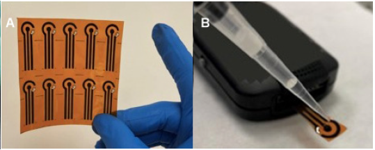 Otro de los electrodos innovadores para la determinación de fen-tanilo se produjo con inducción de energía láser sobre hojas de poliimida para crear estructuras nanoporosas de carbono [138]. Los autores afirman que, con base en los resultados, la rugosidad de la superficie no solo aumenta la sensibilidad, sino también la selectividad al llevar a cabo el análisis en presencia de algunos agentes cortantes como la cafeína y el ácido ascórbico. El LOD obtenido por este sensor es de 0,336 gg/mL y se midió en muestras de suero humano enriquecidas con el opioide con la técnica SWV (Figura 9). Un dato interesante que aportan los investigadores es que un bloque de diez electrodos, como el que se muestran en la Figura 9, tiene un costo de tan solo 1 USD.