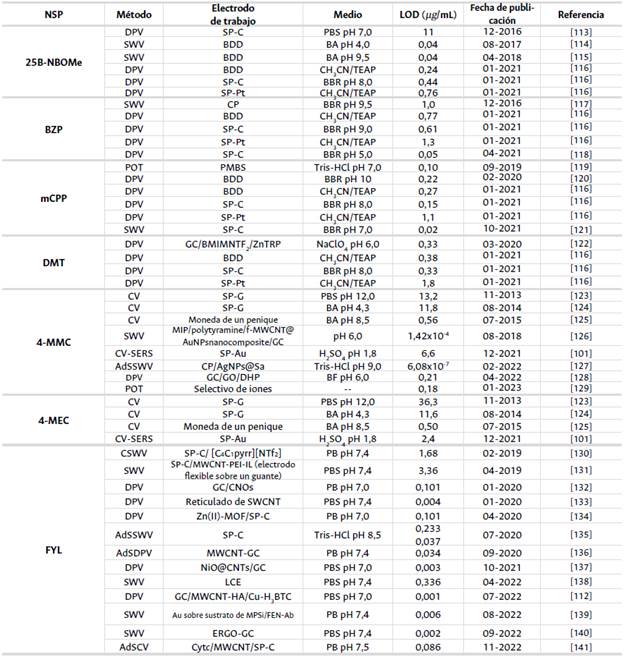 En la Tabla 1 se muestran los sensores electroquímicos reportados para la determinación cuantitativa de las siguientes sustancias psicoactivas sintéticas: las piperazinas BZP y mCPP, la fenetilamina sustituida 25B-NBOMe, la triptamina DMT, las catinonas 4-MMC y su derivado 4-MEC, así como el opioide FYL.