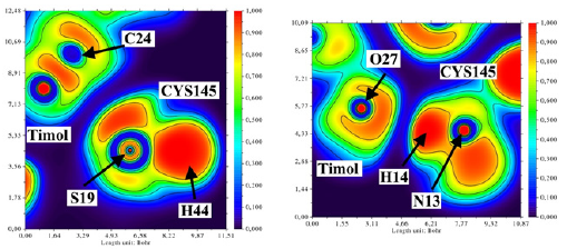 Por su parte, en la Figura 10 se presentan los mapas ELF para la interacción entre el timol (átomos C24 y O27) y el residuo CYS145 (átomos S19 y H14). En ambos casos se puede observar que los pares libres de electrones participan en la interacción molecular, tanto para el átomo de azufre (S19) como para el átomo de oxígeno (O27). Los pares de electrones libres del oxígeno están orientados hacia el átomo de hidrógeno del grupo amino de la CYS145. Este comportamiento es característico para la formación de un enlace de hidrógeno. Finalmente, para el átomo de carbono se observa que la distribución electrónica está influenciada por la naturaleza del anillo aromático.