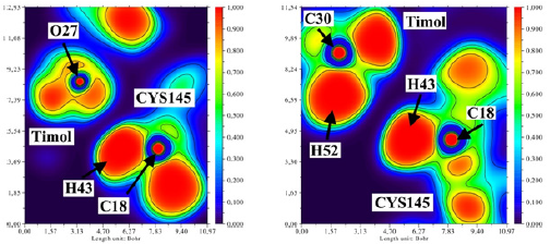 En la Figura 11 se observan los mapas ELF para el timol (átomos O27 y H52) con el residuo CYS145 (átomo H43). En ambos casos se muestra que el átomo de hidrógeno del residuo CYS145 interviene en ambas interacciones moleculares. Adicionalmente, se observan zonas de alta concentración electrónica (color rojo) entre el hidrógeno H52 del timol y el H43 del residuo CYS145 característico de una interacción estérica no covalente hidrógeno-hidrógeno, lo cual corrobora lo observado para el Laplaciano electrónico en la Figura 8 con la presencia de un punto crítico de enlace entre el H52 del timol y el H43 del residuo CYS145 [41].