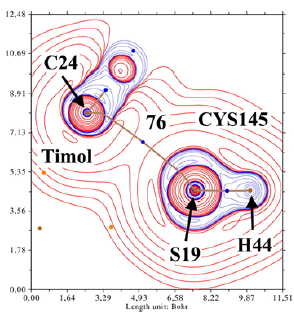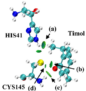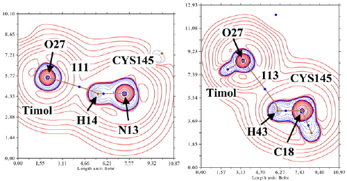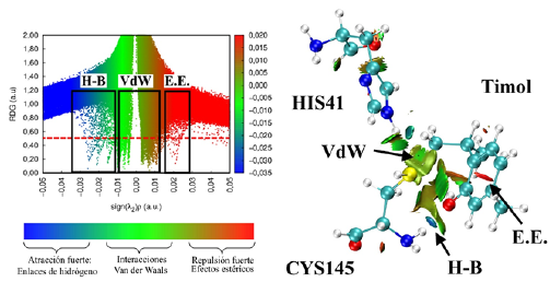 Asimismo, se caracterizaron las interacciones moleculares entre el timol y los residuos HIS41 y CYS145 utilizando las teorías QTAIM, ELF, RDG e IGMH. Estas teorías permitieron identificar la presencia de enlaces de hidrógeno y otras interacciones no covalentes. El análisis QTAIM mostró puntos críticos de enlace y la existencia de un enlace de hidrógeno entre el grupo OH del timol y el residuo CYS145 con valores de Laplaciano y densidad de energía total de 0,01036 y 0,0027 u.a. Además, ELF reveló cómo los pares de electrones libres en el oxígeno se orientan hacia el hidrógeno en CYS145, lo que favorece la formación del enlace de hidrógeno.
