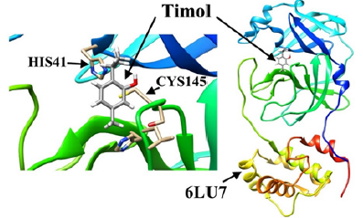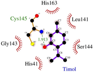 Se emplearon métodos computacionales para analizar las interacciones moleculares entre el timol y los residuos clave en el sitio activo de la proteasa 3CL del SARS-CoV-2. Los resultados obtenidos a través del acoplamiento molecular revelaron que el timol se une al sitio activo de la 3CLpro, con una energía de interacción de -3,784 kcal/mol y una constante de inhibición de 1,29 mM. El mapeo de las interacciones mostró la formación de enlaces de hidrógeno e interacciones hidrofóbicas con los residuos de aminoácidos HIS41, LEU141, GLY143, SER144, CYS145 e HIS163.