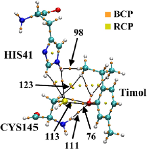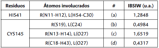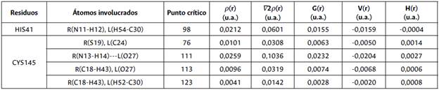 La Teoría Cuántica de Átomos en Moléculas (QTAIM) desarrollada por Bader [27], [28] es una herramienta muy útil para comprender la estructura química y la reactividad a partir de la densidad electrónica (p(r)), y también es utilizada para el análisis de interacciones no covalentes. La existencia de puntos críticos de enlace (BCP) entre los residuos HIS41 y CYS145 de la proteasa 3CLpro con el timol sugiere la presencia de varias interacciones moleculares (ver Figura 4). Entre estas interacciones, las más destacadas son los enlaces de hidrógenos y las interacciones dispersivas tipo Van der Waals. La Tabla 1 muestra los parámetros topológicos evaluados. El signo del valor del Laplaciano de la densidad electrónica (ï72 p(r)) permite evaluar el comportamiento de la densidad electrónica en el punto crítico de enlace, y la densidad de energía total (H(r)) permite evaluar la estabilidad de la interacción molecular [37], [38]. Estos valores son reportados en unidades atómicas (u.a.).