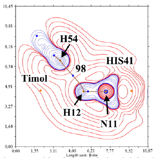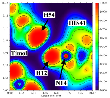 En la Figura 9 se muestra el mapa ELF para la interacción molecular entre el timol y el residuo HIS41 en el plano para los átomos H54, H12 y N14. Este mapa revela zonas de color rojo asociadas a un carácter covalente, lo cual indica una alta localización de electrones, característica de un enlace covalente, lo que se correlaciona con lo obtenido por el análisis QTAIM.
