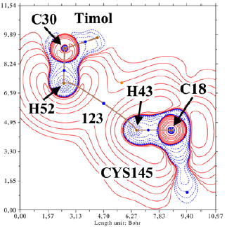 Adicionalmente, se observa la formación de un punto crítico de enlace entre el átomo de azufre del residuo CYS145 y un carbono del anillo aromático del timol (ver representación en la Figura 7). Los valores del Laplaciano electrónico y de la energía total sugieren una interacción covalente o parcialmente covalente de capa cerrada, debido a que los anillos aromáticos tienen densidades electrónicas altas como consecuencia de la deslocalización electrónica. Este hecho puede afectar la naturaleza y la fuerza de la interacción entre el átomo de azufre S19 y el átomo de carbono C24. Por otra parte, se observa la formación de un punto crítico de enlace entre un grupo -CH del timol y otro -CH del residuo CYS145 (ver Figura 8); este tipo de interacción es conocida como enlace de dihidrógeno y es muy similar al enlace de hidrógeno convencional, pero existe una fuerte interacción electrostática entre los átomos de hidrógenos con cargas parciales opuestas. Además, existe una contribución de fuerza de atracción de Van der Waals [44], [45]. El valor del Laplaciano electrónico obtenido de 0,0142 u.a. se encuentra dentro del rango reportado para este tipo de interacciones intermoleculares (0,0140,139 u.a.) [46].