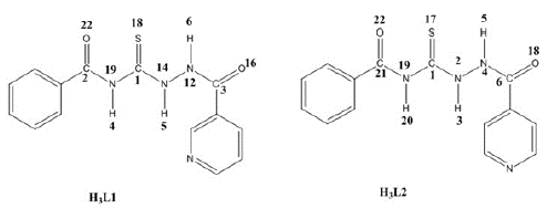 Abstract: The compounds N-(2-nicotinoylhydra-zine-1-carbonothioyl)benzamide (H3L1) and its isomer N-(2-isonicotinoylhydra-zine-1-carbonothioyl)benzamide (H3L2) type N, S, O donors, by reaction of benzoyl isothiocyanate with nicotinic hydrazide and isoniazid respectively were synthesized. The H3L1 and H3L2 compounds were characterized by 1H-NMR, 13C-NMR, FT-IR and elemental analysis. Computational analysis using the Fukui functions were performed to determine the reasons why the 1,2,4-triazoles were not formed. Preliminary tests of the synthesized compounds were carried out against Staphylo-coccus aureus (Gram+) and Escherichia coli (Gram-), having demonstrated significant activity against such bacteria.