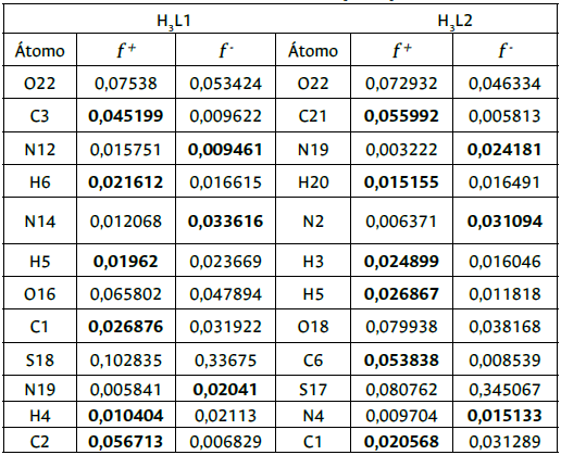 En la Tabla 1 se reportan los valores de la función de Fukui elec-trofílica y nucleofílica para los compuestos H3L1 y H3L2 para los átomos más importantes; estos valores han sido calculados con cargas Hirshfeld [31]- [33], las cuales han sido calculadas a nivel de la teoría DFT B3LYP/6-31G++ (d, p), a partir de las estructuras neutras optimizadas con B3LYP/6-31G (d, p). Todos los cálculos fueron realizados con el paquete de programas Gaussian 09W. Rev. A02 [34], implementado en un PC Workstation AMD Fx(tm)-4300 3,80 GHz Quad-Core Processor, 4GB RAM.