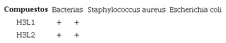 Los análisis de eficacia antimicrobiana contra Escherichia coli(bac-teria gram-negativa) con cepa tipo ATCC 11229 y Staphylococcus aureus (bacteria gram-positiva) con cepa tipo ATCC 6538, de los compuestos H3L1 y H3L2, fueron realizados por el método AOAC Oficial Methods of Analysis (Use-Dilution Method (2) Official Final Action), el cual proporciona las diluciones adecuadas y los tiempos de exposición para evaluar la eficacia del candidato a desinfectante.