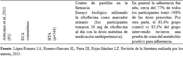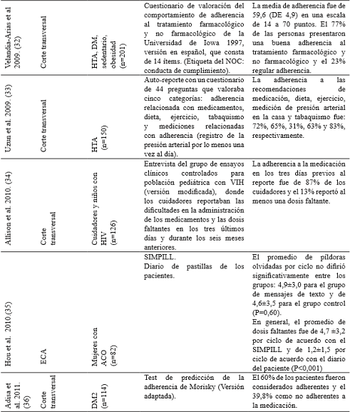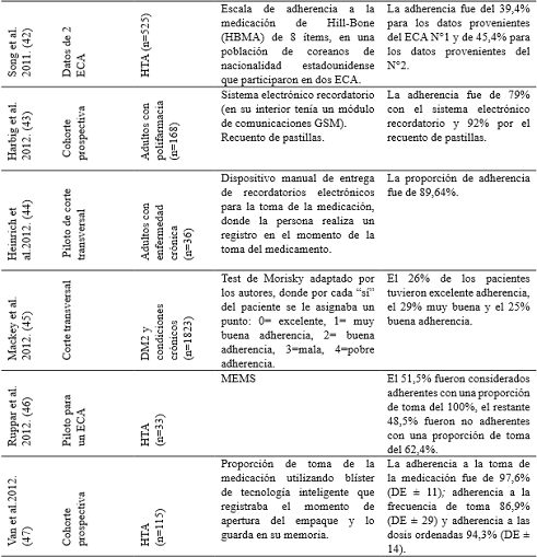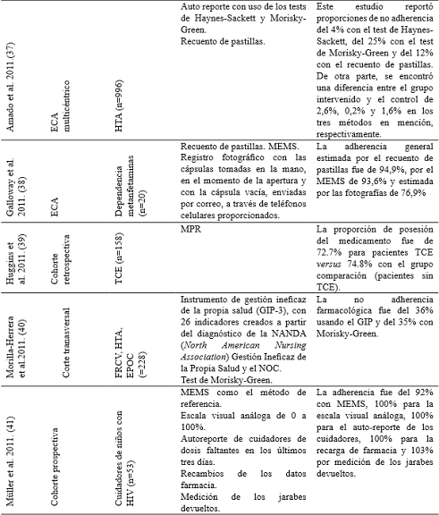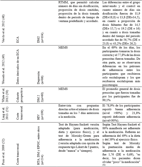 Por otra parte, es necesario aclarar que una de las grandes limitaciones del presente estudio fue el haber incluido variedad de diseños y población en donde se midió la adherencia, por lo cual las conclusiones son muy heterogéneas y la extrapolación de los resultados debe hacerse con precaución.