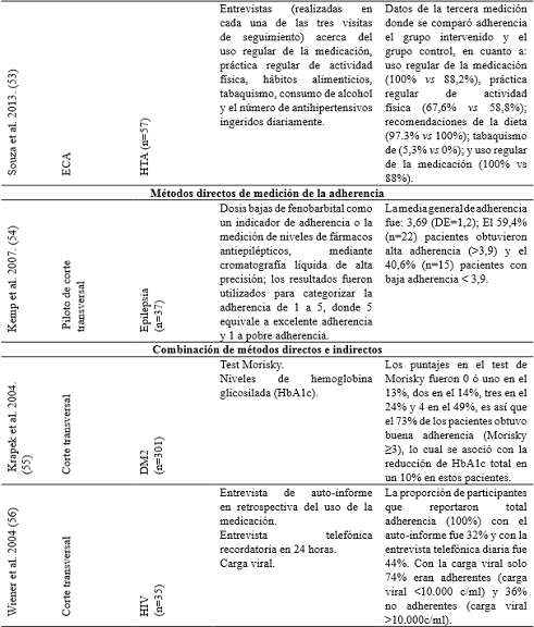 Abstract: Objective: To carry out a synthesis of the concept of adherence and describe the methods used to measure it. Methodology: Review article. A search, selection and review of original and secondary articles published between 2004 and 2013, written in English or Spanish in different databases including Scielo, Pubmed, Cinahl, Science@direct and Ovidsp which were was carried out. Results: A total of 53 articles were selected, 13 of which defined the concept and classification of methods; 32 were research studies that used indirect methods, 17 combined direct and indirect methods and one study used a direct method. Conclusions: The use of different concepts defining adherence, without a consensus was evident. Also, different techniques were used for measurement being the most widely used indirect methods, followed by the combination of direct and indirect methods.